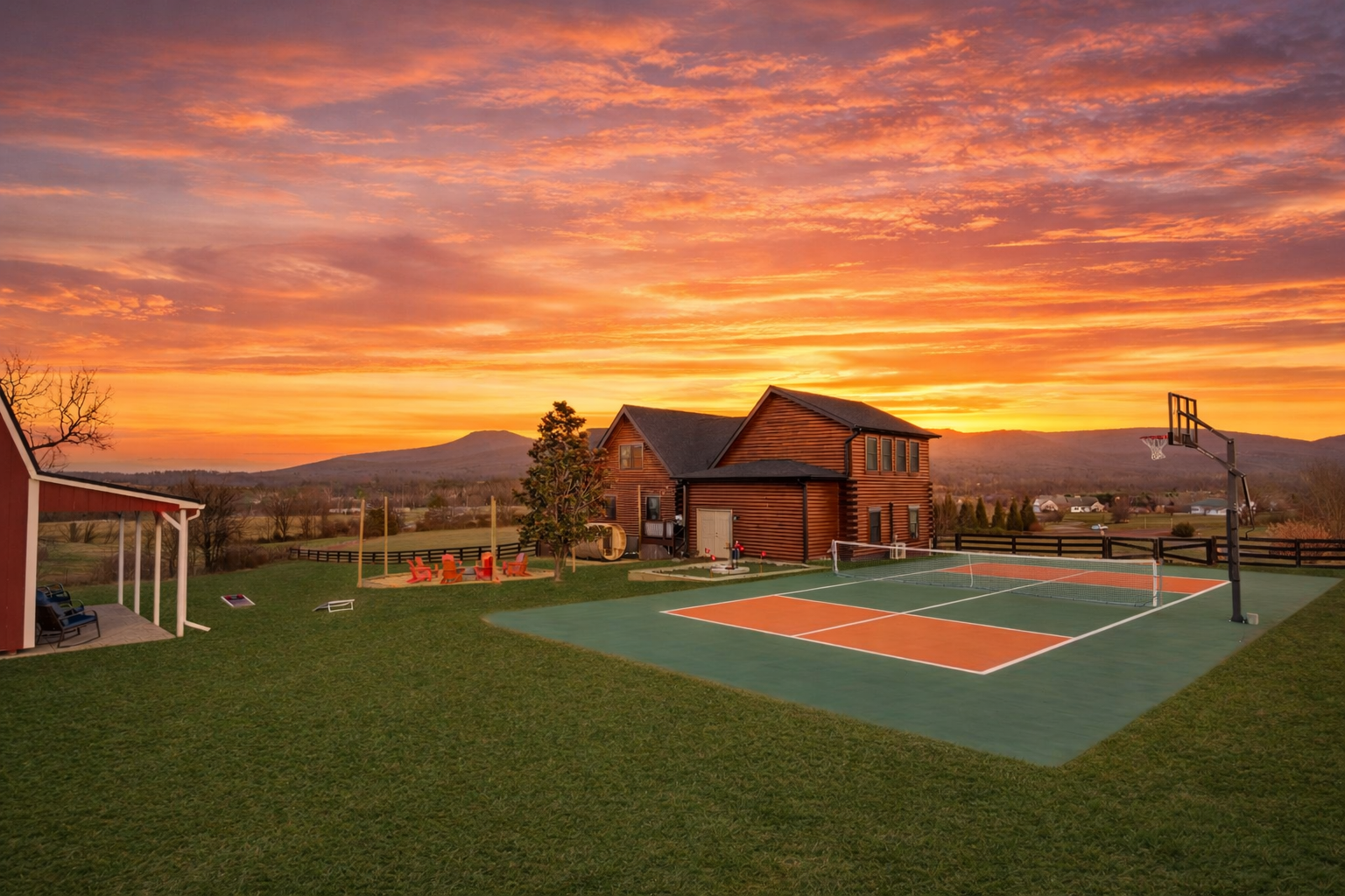 Picture mist lifting off the mountains as you cradle a hot mug on the screened porch, pink skies spilling over the ridges while the valley wakes in birdsong. Then head out to explore Luray Caverns, take a scenic hike, float the river, or cruise Skyline Drive from overlook to overlook. When you return, the lodge has everything waiting: a hot tub steaming under the open sky, a pickleball court for friendly matches, a peaceful yoga room, an arcade-style game room buzzing with laughter, a gym for quick workouts, and quiet corners where you can finally finish that book.